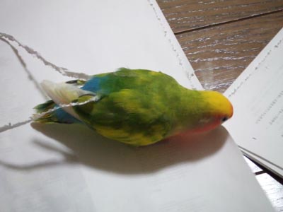 特に、コザクラインコのメスは、紙を細長く切り取るようにかじり、腰の羽に