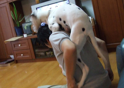 パールはメス(避妊手術済)なんですが、なんだか背中によじ登るときの