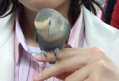 うちのコザクラだって、胸の前に指を出すと、ぴょいと乗りますが、