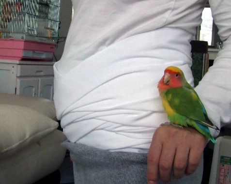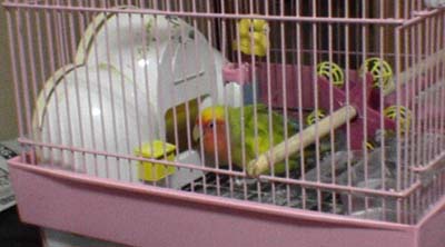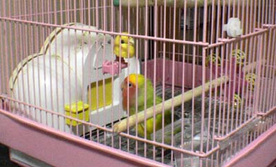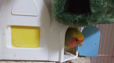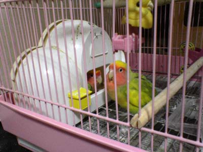 姉がバイオリンを返却しに家に来たとき、久しぶりに、コザクラインコのちょびが寝室にしている