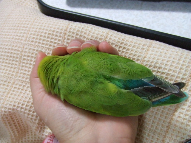 袖のひじのあたりでとどまって、気に入ったらしく、ピィ!ピィ!と、新しい縄張りを