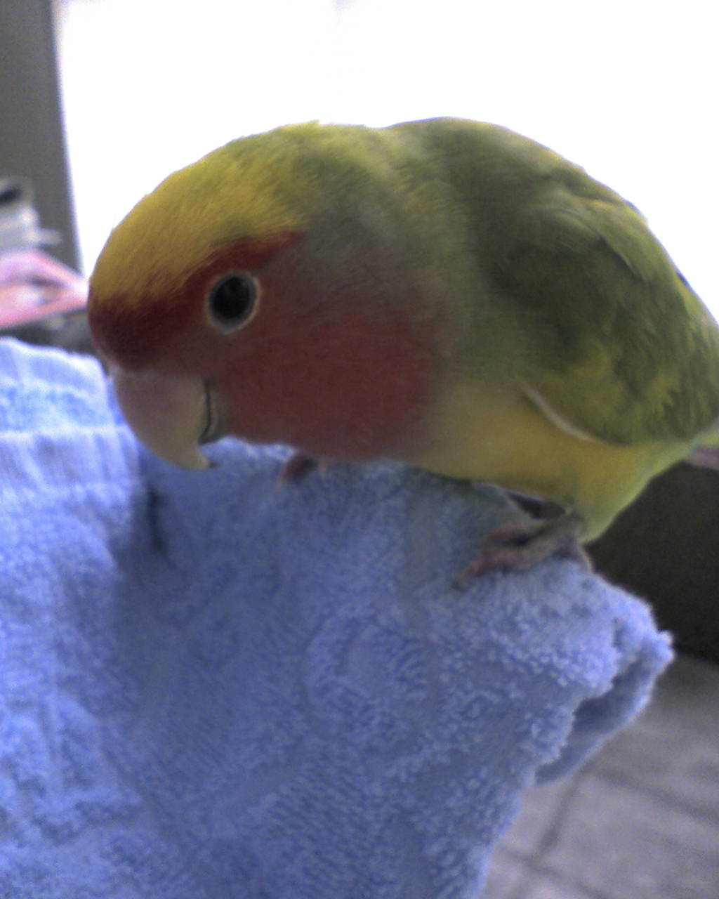 キャリングケースに入れて車や電車で移動するときは、不規則な揺れに対応するため、ずっとカゴの側面をクチバシでくわえて安定させた姿勢を取っています。ちょっと辛そうかな。